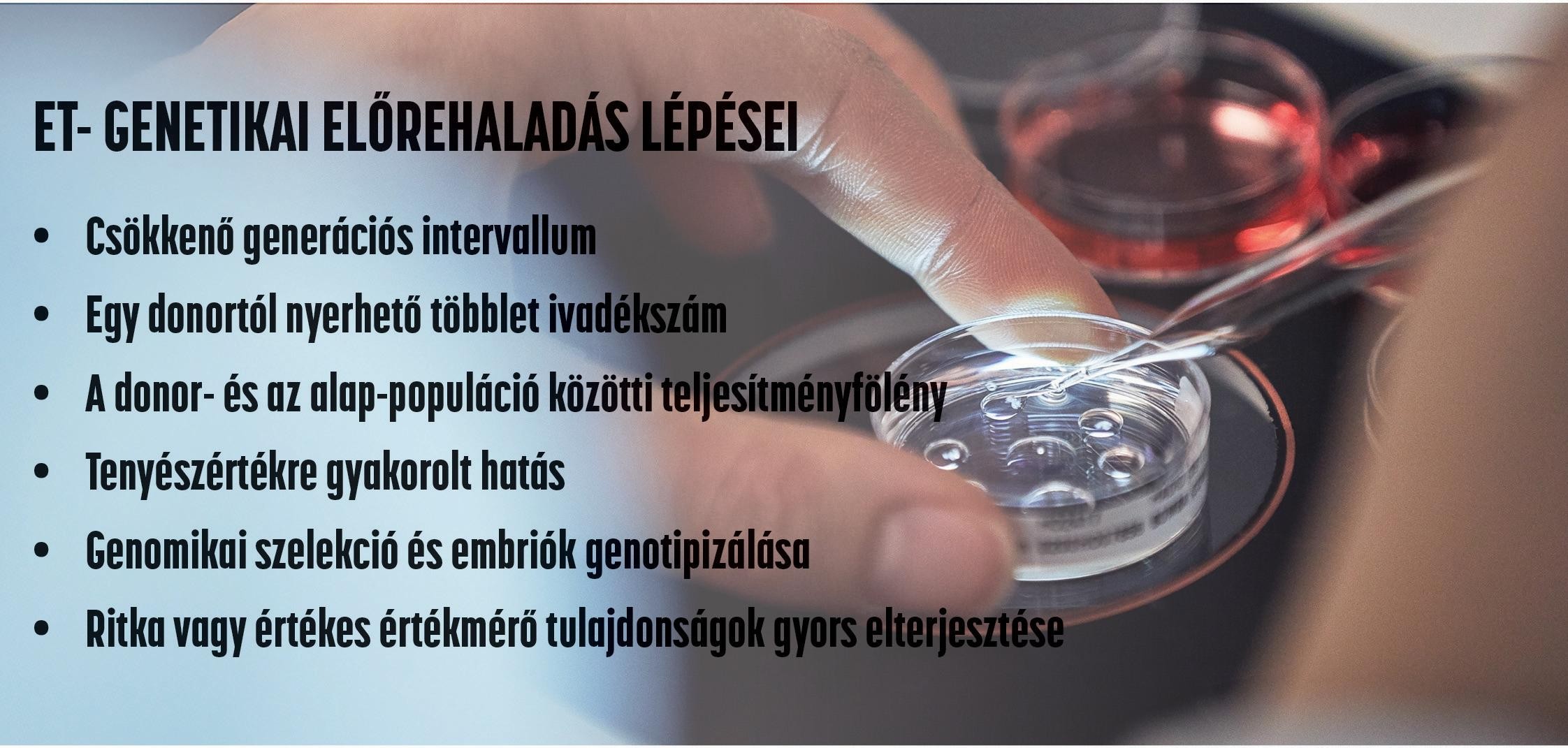 E nagy mennyiségű csúcsgenetikát képviselő IVF embriót frissen, illetve később fagyasztva, a megfelelően kiválasztott recipiensekbe beültetve jelentős genetikai előrehaladást lehet elérni.