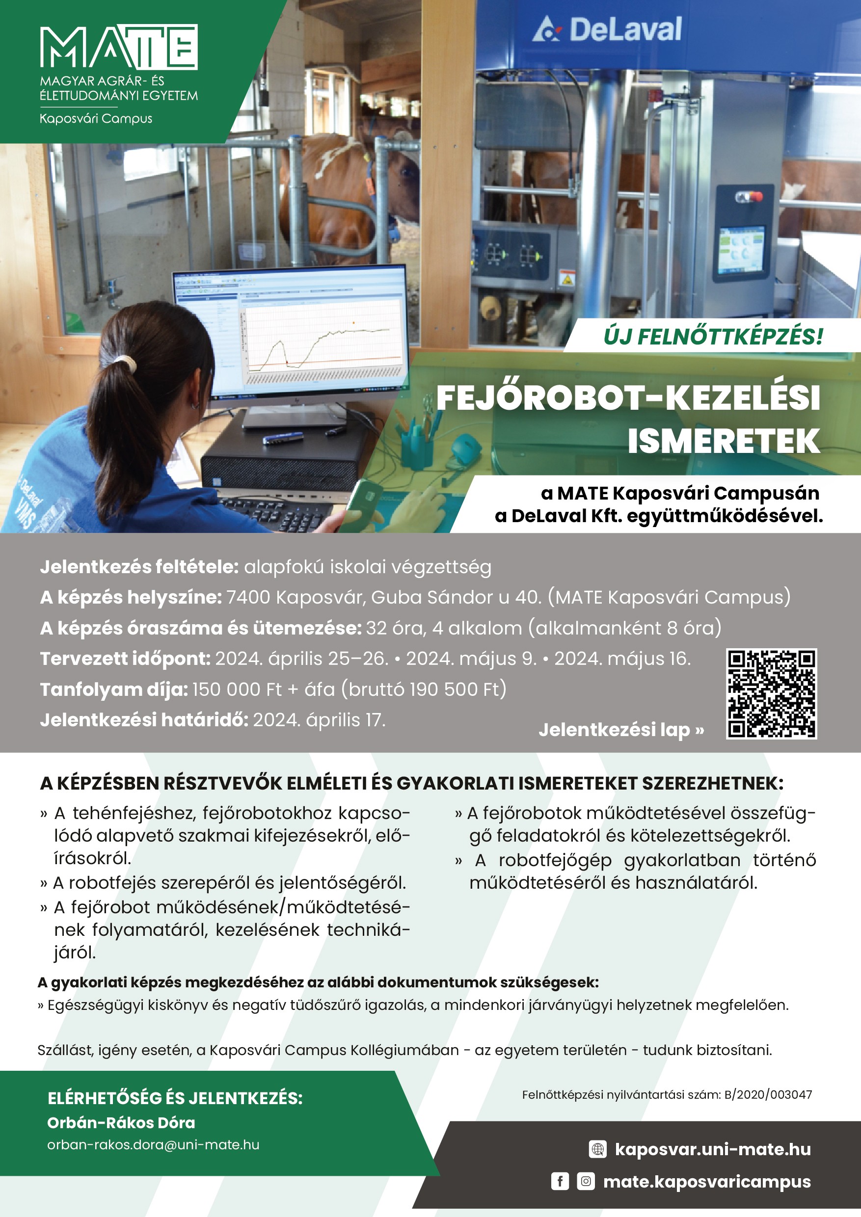 A fejőrobotok egyre nagyobb népszerűsége és térnyerése kapcsán ajánljuk figyelmükbe a MATE Kaposvári Campus új felnőttképzési programját: fejőrobot-kezelési ismeretek. A tanfolyamról további információk: